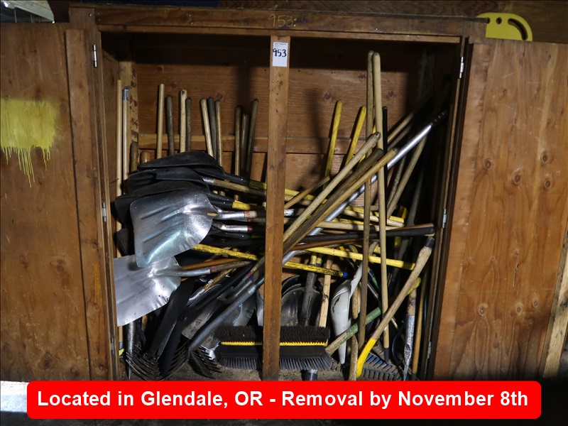 LOT, ASSORTED CLEAN UP TOOLS IN WOOD CABINET BY LOT 349 VIBRATORY CONVEYOR