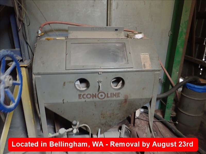 APPROX 16' X 30' X 10' DOUBLE DOOR DRIVE IN SAND BLAST BOOTH, CLEMCO 245 PNEUMATIC SAND BLAST POT W/HOSES, CLEMCO SHOT RECLAIM SYSTEM, VERTICAL SHOT TANK W/(4) TAKE AWAY BINS, DUST COLLECTOR & CONTROLS