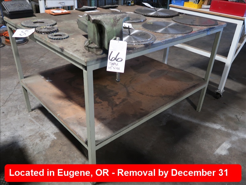 APPROX 48" X 60" STEEL FRAMED WOOD TOP TABLE W/8" VISE (MUST WAIT UNTIL EMPTY TO REMOVE)