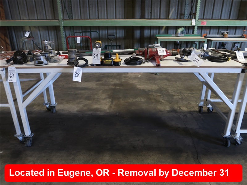 APPROX 36" X 96" STEEL FRAMED WOOD TOP TABLE ON CASTERS (MUST WAIT UNTIL EMPTY TO REMOVE)