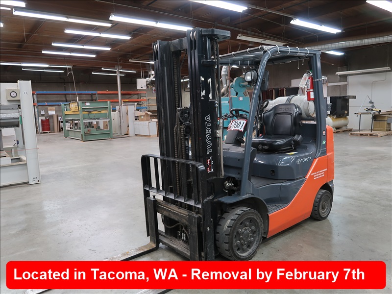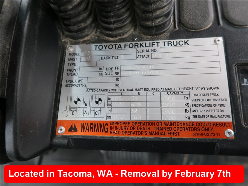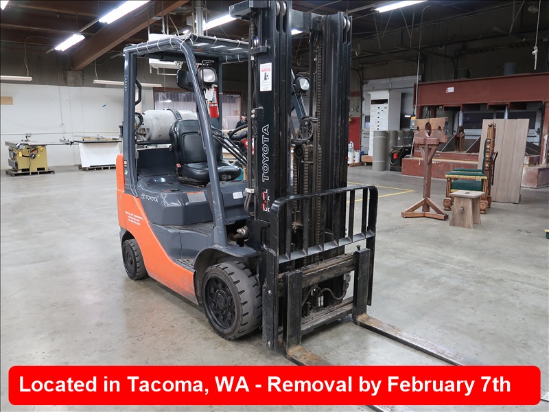 4,500 LB HRT FORKLIFT, 189" 3-STAGE MAST, SIDE SHIFT, PROPANE, FORK LEVELER, HOUR METER READS: 443 (MUST STAY UNTIL 8 AM, TUESDAY, FEB 4TH)
