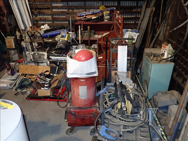 GROUP OF SHOP TOOLS & EQUIPMENT, PRESSURE WASHERS, OXY/ACET TANKS, CARTS, HOSE, FLOOR JACKS, TILE SAW, MITER SAW, STEEL TABLE, CARTS, JOB BOXES, PNEUMATIC TOOLS