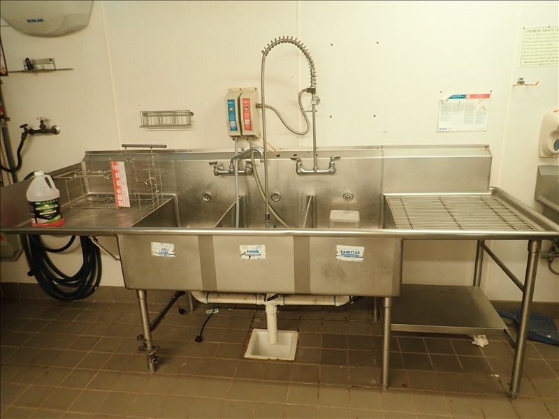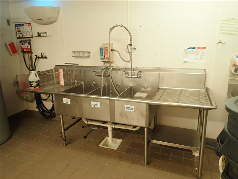 106” 3-COMPARTMENT S/S SINK W/(2) FAUCETS, RINSE WAND & S/S SHELF