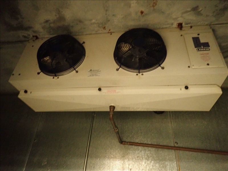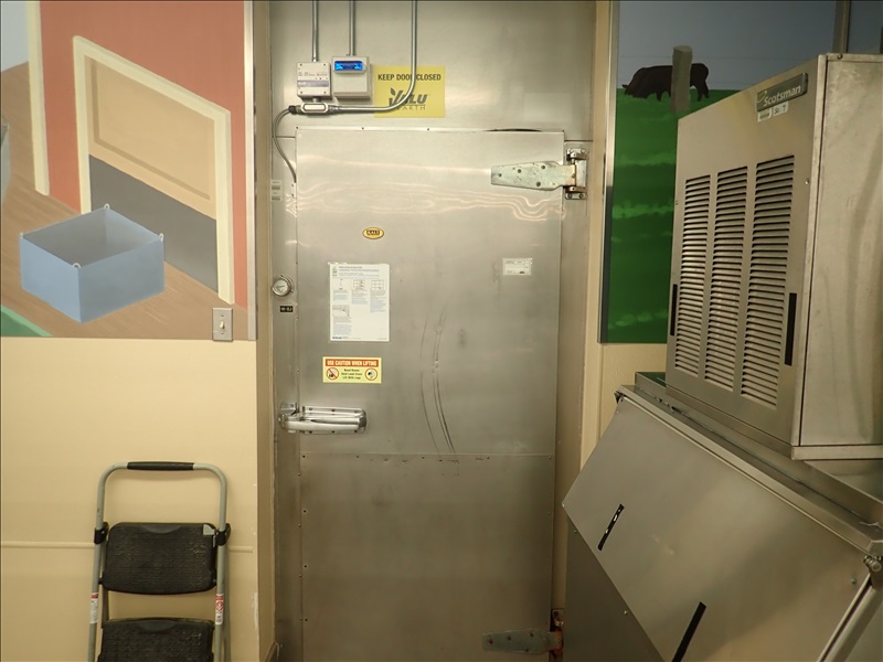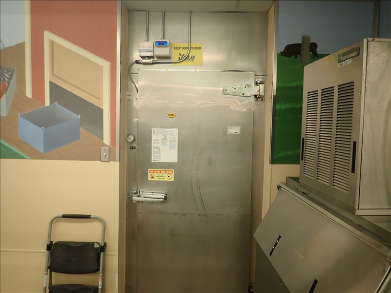 KALT APPROX. 5’X12’X8’ WALK-IN MEAT COOLER, S/S MAN DOOR, LARKIN 2-FAN EVAPORATOR, LIGHTS & MODULARM DL-35 DOOR MONITOR