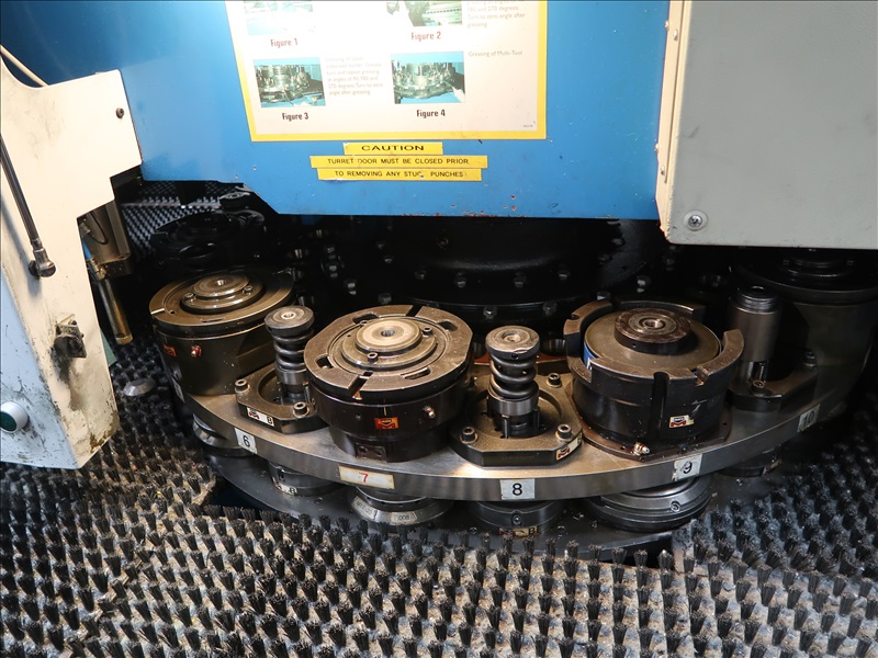 90 STATION CNC TURRIT PUNCH, 6' X 14' LANDING TABLE, 12' AUTO LOADER, 3x400V, 3X80AMP, 60HZ, 3-PHASE, AUTOMATIC OILER, HYDRAULIC PUMP W/ TANK, 230KN PUNCHING FORCE, 300 BAR MAX WORKING PRESSURE, W/SIEMENS SINUMERIK CONTROLS, S/N: 9.2-a42071297