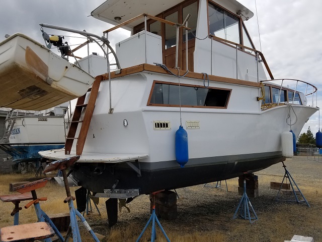 34' POWERBOAT WHITE HULL / INBOARD MOTOR / INCLUDES 8' PLASTIC DINGHY + SMALL O/B MOTOR