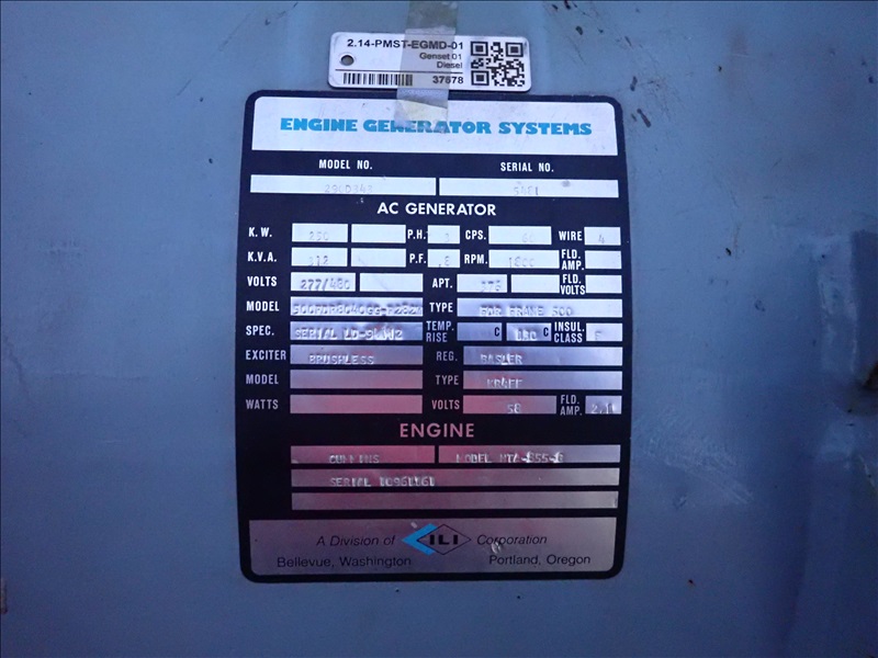 250 KW 277/480V, 3 PHASE,STANDBY GENERATOR, CUMMINSNTA855GHOUR METER READS: 1,230(CITY DISCLOSURE: ENGINE OILPAN LEAK & ELECTRIC SIDE HASERRATIC CURRENT FLOW)