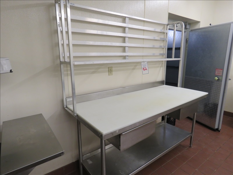 72" SS WORK TABLE W/POLY TOP, UPPER & LOWER SHELF & 2-DRAWERS