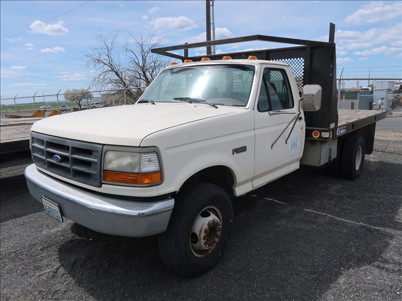 STANDARD CAB 2WD PICKUP, GAS ENGINE, 5-SPEED MANUAL TRANSMISSION, 12' FLATBED W/HEADACHE RACK, DUAL WHEELS