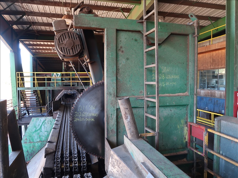 INSERT TOOTH WHOLE LOG CUT OFF SAW W/TOSHIBA 75 HP/1,188 RPM MOTOR, APPROX 65' 4-STRAND WR124XHD CHAIN INFEED LOG HAUL, S-DRIVE, MOTOR TO REX DRIVE, APPROX 34' 4-STRAND WR124XHD OUTFEED LOG HAUL, MOTOR TO REX DRIVE, SCANNER SENSORS
