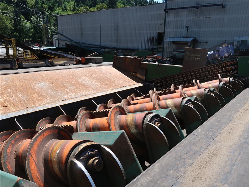 CUSTOM BUILT LOG SCREW SINGULATOR FROM MERCHANDISER W/(6) 10'L LOG SCREWS W/TOSHIBA 30 HP MOTOR TO REX POLARIS 32 RPM REDUCER, 20'W W/10' TRIPLE STRAND EVEN END CHAIN W/SUMITOMO 10 HP/179:1 RATIO GEARHEAD MOTOR