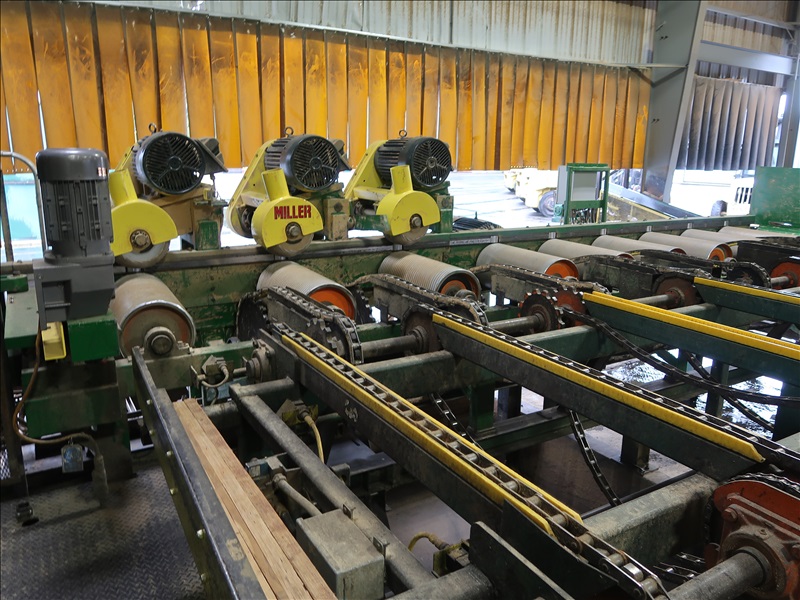 AIR LIFT TRIMMER, CUT 24', PASS 30', S/N:21253L W/(13) 20" 10 HP/3,4450 RPM INDIVIDUALLY MOTORIZED SAWS, ZERO SAW & 2'-24' SAWS, APPROX 13' 10-STRAND 81X LUGGED PASS THRU TRANSFER W/(7) 108" EVEN END ROLLS, APPROX 26' 10-STRAND 81X LUGGED OUTFEED TRANSFER W/(9) 17' EVEN ENDING ROLLS, CUT-IN-TWO STATION APPROX 30' X 5-STRAND 81X LUGGED, SPARE 20" SAWS & PARTS, ALLEN BRADLEY MCC (PLANER MILL)