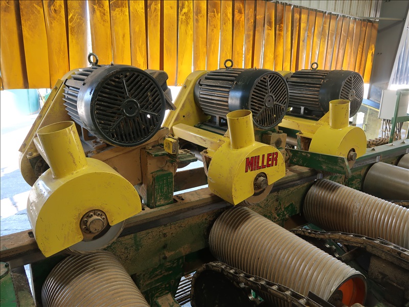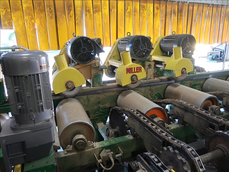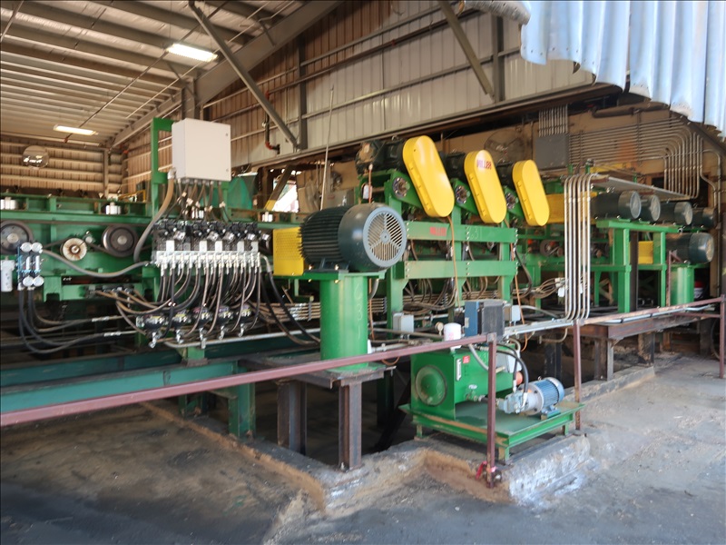 20' TRIPLE PINEAPPLE FEED TABLE W/15 HP MOTORS, HYDRAULIC DRIVEN SPEED UP ROLL, (9) 14" X 30" SPIRAL ROLLS W/TOSHIBA 15 HP/875 RPM MOTORS, 48" EVEN END CHAIN W/GEARHEAD MOTOR, 5' 7-STRAND INFEED TRANSFER W/HYDRAULIC DRIVE