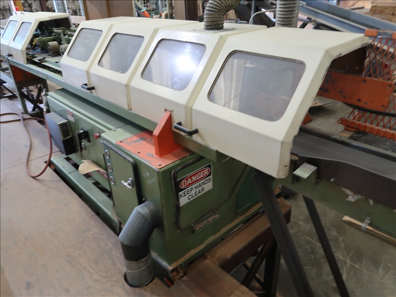 CUT OFF SAW OPTIMIZER W/7-1/2 HP SAW, (12) 6" BOTTOM FEED ROLLS, (12) 3-1/2" HOLD DOWN ROLLS, 8" X 20' POWERED INFEED ROLLCASE, 8" X 32' OUTFEED BELT W/(5) KICKERS & SLIDE TABLE, 36" X 72" INFEED SCISSOR LIFT ON RAILS