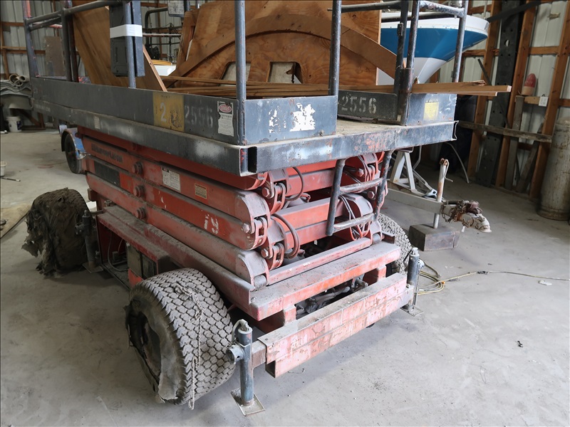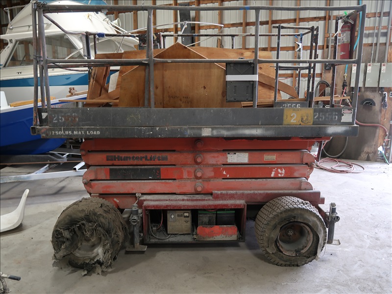 1,250 LB SCISSOR LIFT, 56"X130" DECK, (2)BATTERIES, IC ONBOARD CHARGER (NEEDS TIRES)