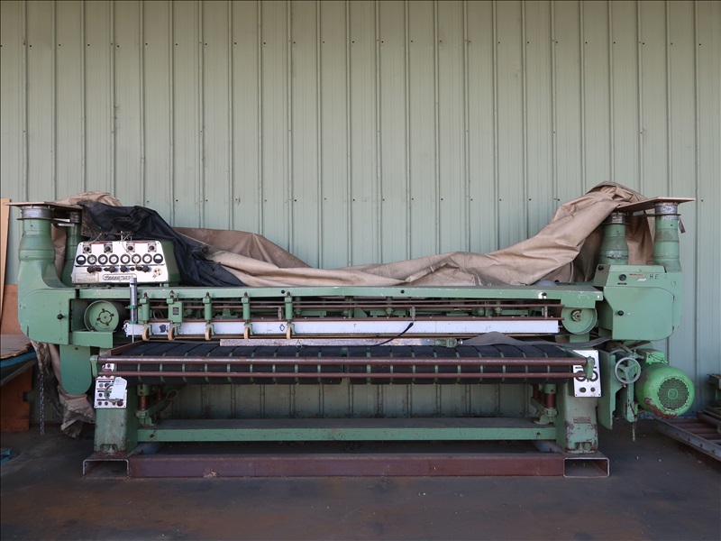 8' TWIN CROSS BELT SANDER W/2,550MM SANDING WIDTH, 18-1/2KW MOTORS & PNEUMATIC PRESSURE BEAM, FED BY PARALLEL CARPET STRIP BELTS W/VARIABLE SPEED, MOTORIZED HEIGHT ADJUSTMENT OF THE TABLE (NOT INSTALLED)