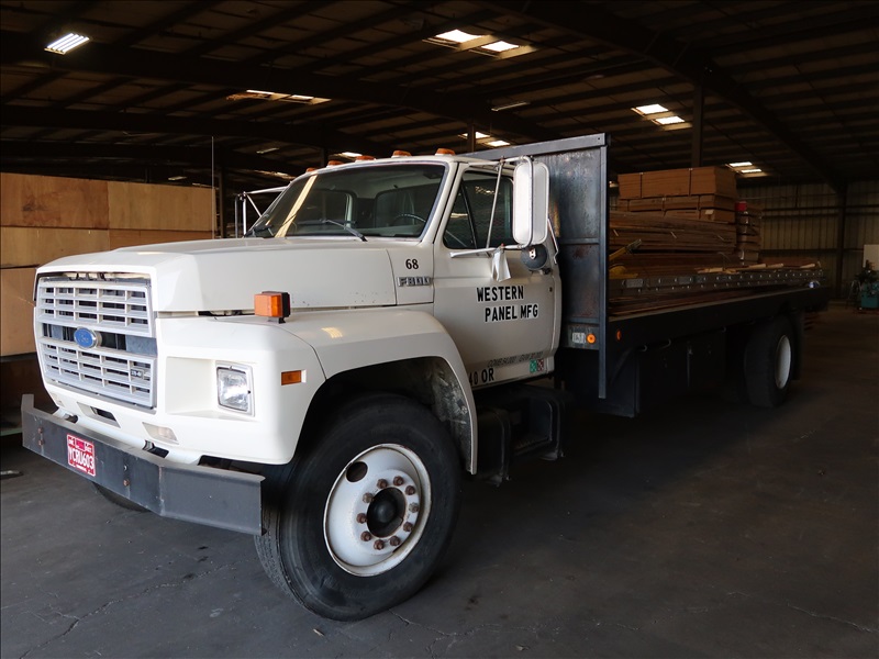 20' DUAL WHEEL TRUCK W/FORD 370-4V DIESEL ENGINE, 5-SPEED MANUAL TRANSMISSION, CHELSEA PTO, 20' BED W/HEADACHE RACK & STAKE POCKETS, R22.5 TIRES