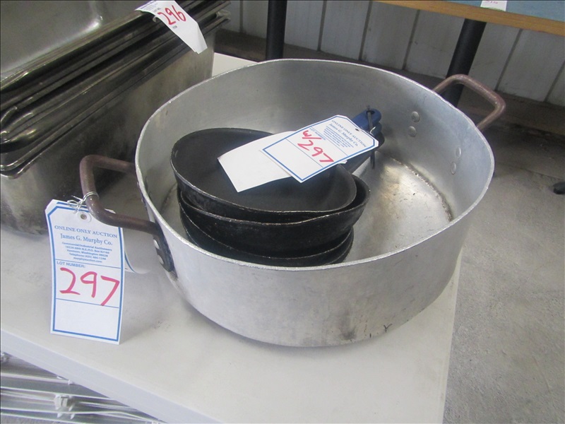 LOT, (5) 8" SKILLETS & ALUMINUM BRAISING POT