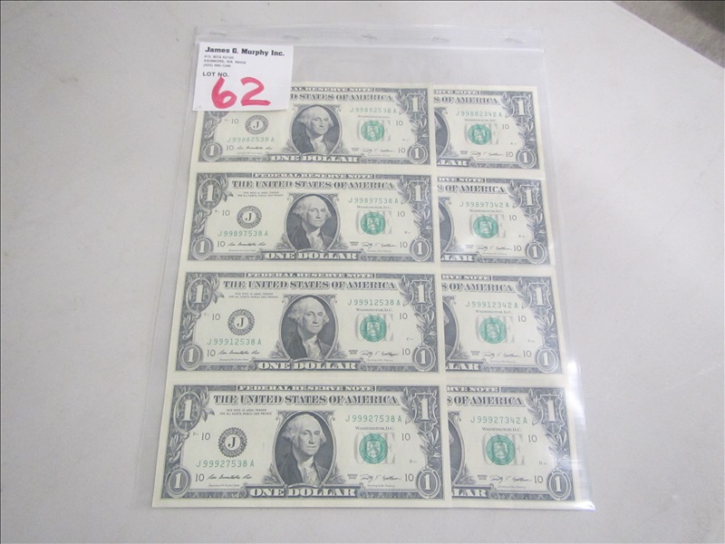LOT, (2) SHEETS OF (4) UNCUT $1 BILLS