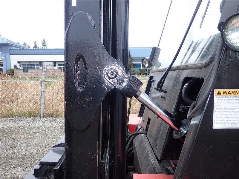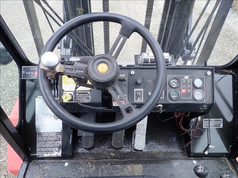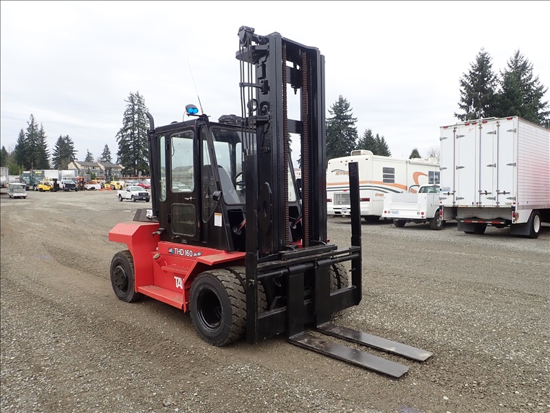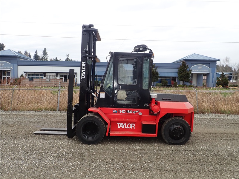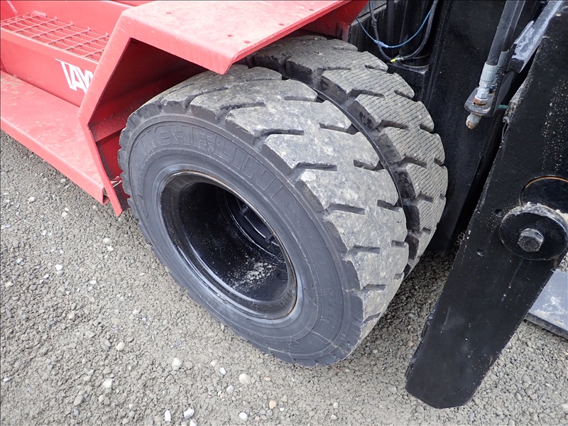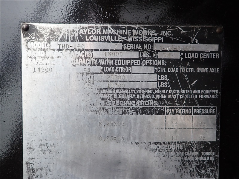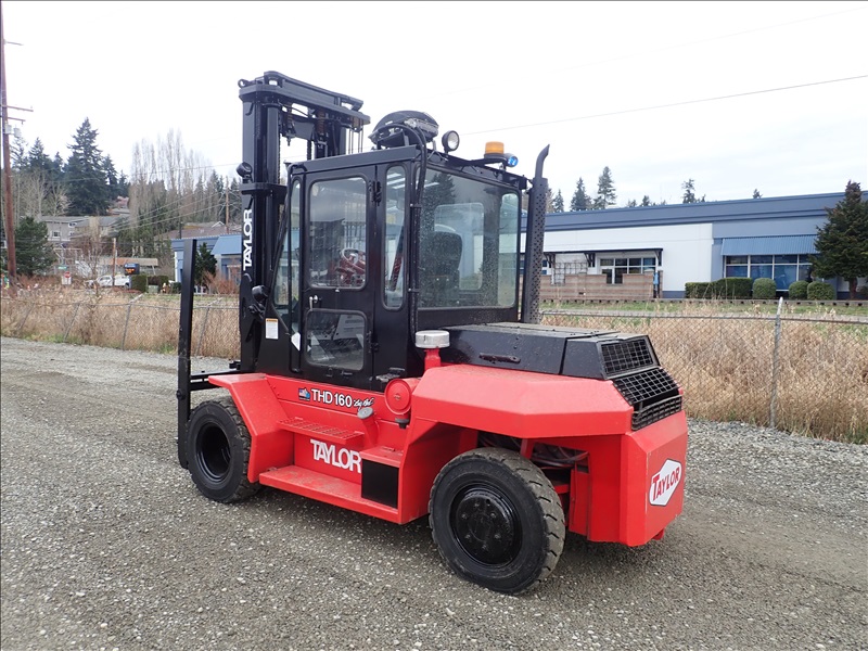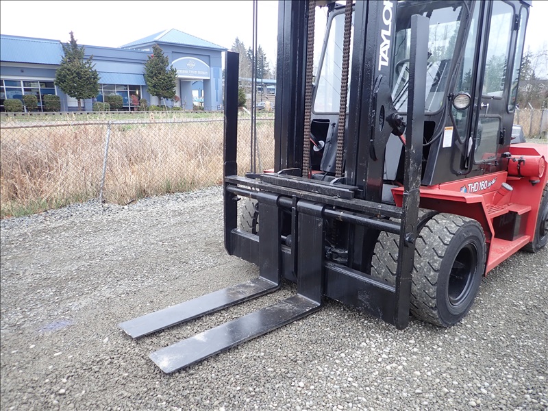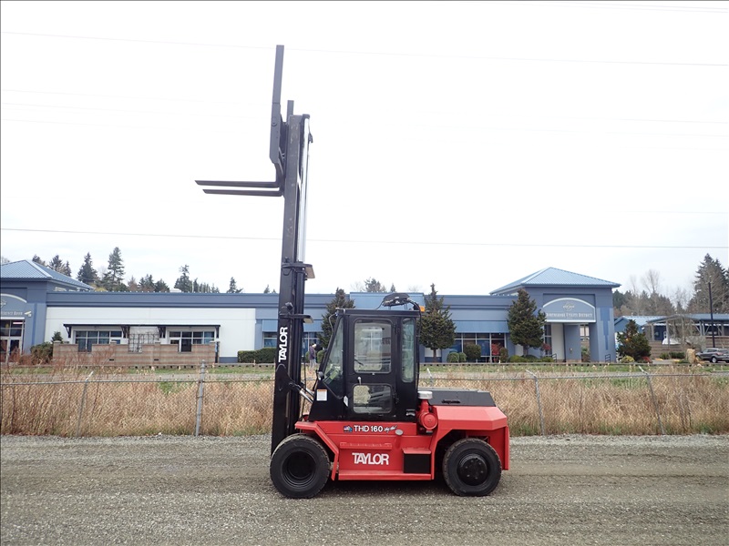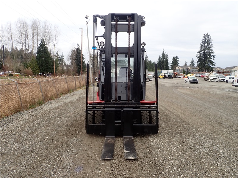16,000 LB DUAL PNEUMATIC TIRE FORKLIFT, 14' 11" FORK HEIGHT, 2 STAGE MAST, SIDE SHIFT, LUMBER FORKS, CUMMINS 3.9, CAB, HOUR METER READS: 28,318
