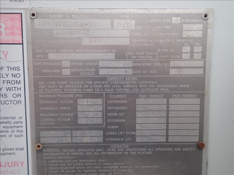 BUCKET TRUCK, HI-RANGER TPL-40, 40', 350 LB, DT466, AUTO