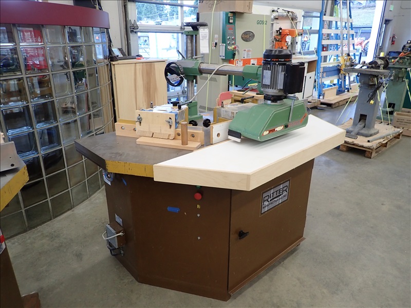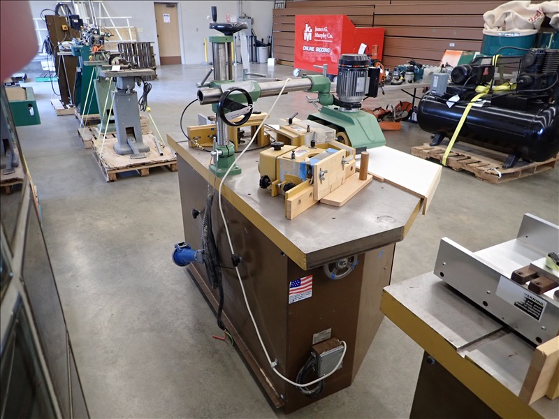 TRIPLE SPINDLE DOOR SHAPER, 3 BALDOR 36A01X100 5 HP, 230V, 3 PHASE, PNUEMATIC HOL DOWNS, MAGGI 2038 3 DRUM POWER FEEDER, 230V, 3 PHASE
