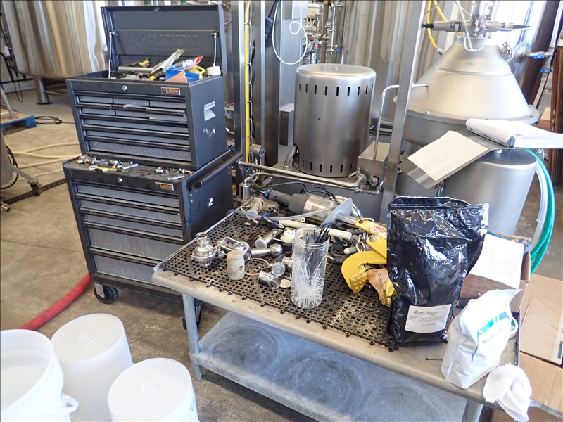 GROUP OF TRANSFER HOSES, FITTINGS, CLAMPS, 3-COMPARMENT SINK, STAINLESS STEEL TABLE, ROBOT COUPE MP450 IMMERSION BLENDER & MISC. BREWING SUPPLIES
