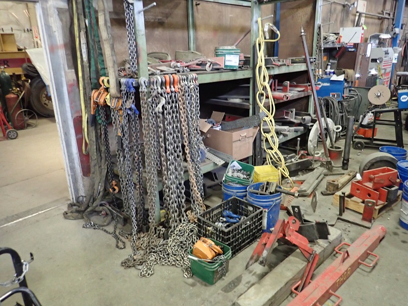 GROUP OF RIGGING RACK W/CHAINS, SLINGS, COME-ALONGS, STRAPS, SHACKLES & MISC