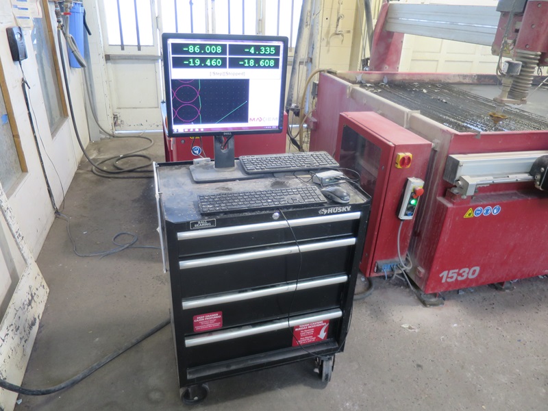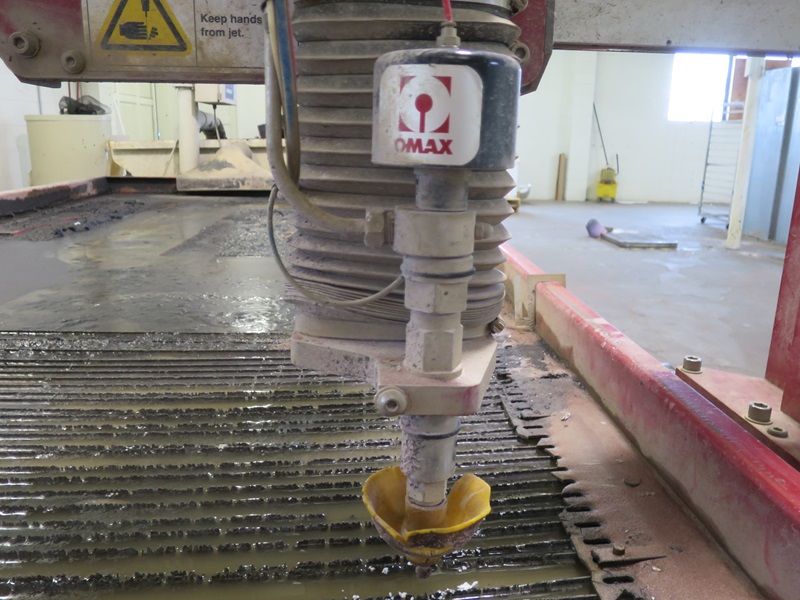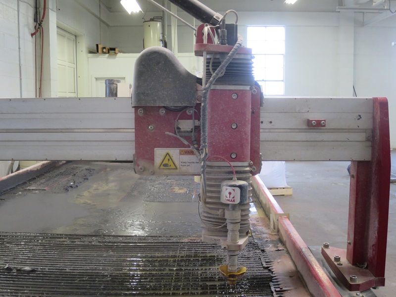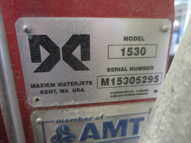 ABRASIVE WATER JET CUTTER MACHINE W/X-Y-Z AXIS MOTION SYSTEM, 5'2" X 10' X-Y CUTTING ENVELOPE, OMAX ARTICULATED GLASS CUTTING NOZZLE, TRACK IS UNDAMAGED, DIRECT DRIVE PUMP, COMPUTER CONTROLLED, PENDANT EMERGENCY STOP/START, CLEMCO 2542 6-CUBIC YARD ABRASION TANK, OMAX 1.5 HP SOLID WASTE REMOVAL SYSTEM SLUDGE PUMP W/TILTING WASTE BIN: 480V, 3-PH