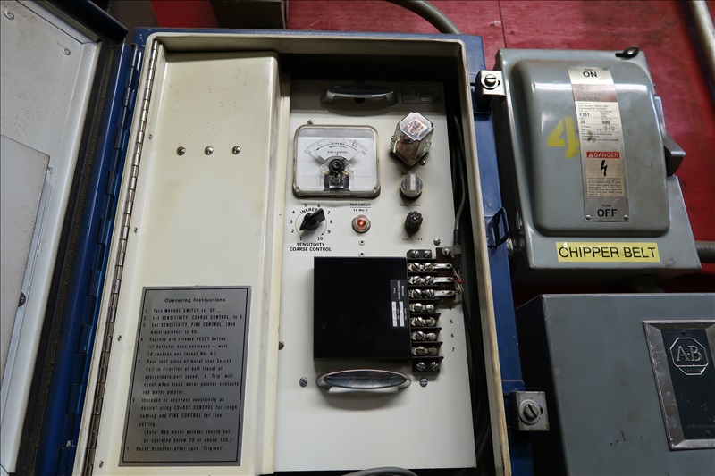 APPROX 30"X80' CHEVRON BELT CONVEYOR W/5' FIBERGLASS TUB, MDI CR85 DIGITAL CONTROL CHASSIS, S/N:EV10005, XR7F CONTROLLER (TO KIMWOOD HOG), S/N: E0423; APPROX 14"X40' BELT CONVEYOR W/5' FIBERGLASS TUB, MDI CCW65A METAL DETECTOR (TO BLACK CLAWSON CHIPPER),