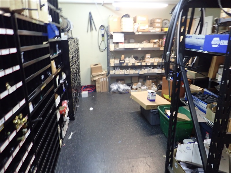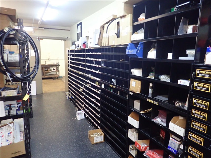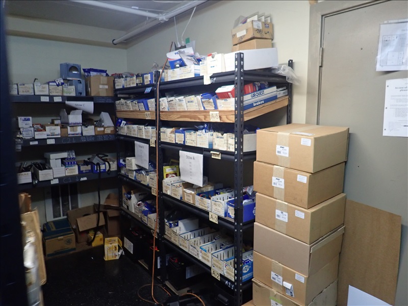 PARTS ROOM TO INCLUDE: PARTS BINS, PARTS DRAWERS, WIRE, NUTS/BOLTS, BUSHINGS, BEARINGS, LIGHTS, HOSES, BRAKE PARTS & MISC