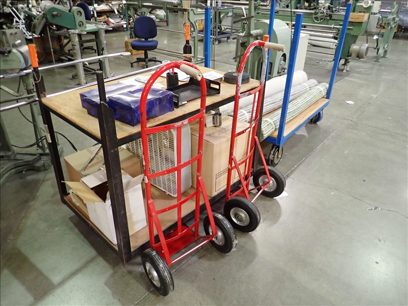(4) HAND TRUCKS, (3) CARTS & (2) WAREHOUSE LADDERS