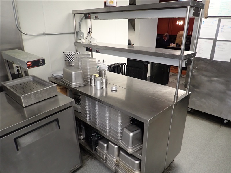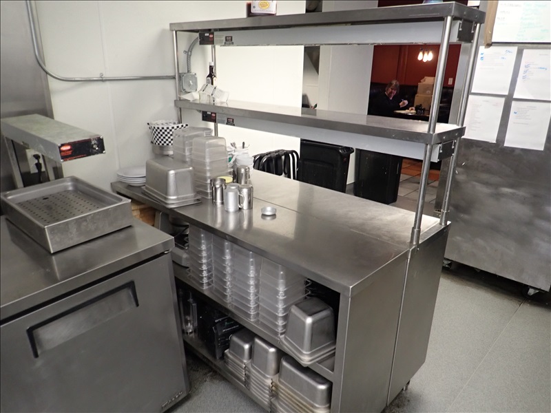 60" S/S CABINET W/WAFFLE MAKER, BLENDER, S/S INSERTS, PLASTIC INSERTS, SHELVES & (2) HATCO GLO-RAY WARMERS