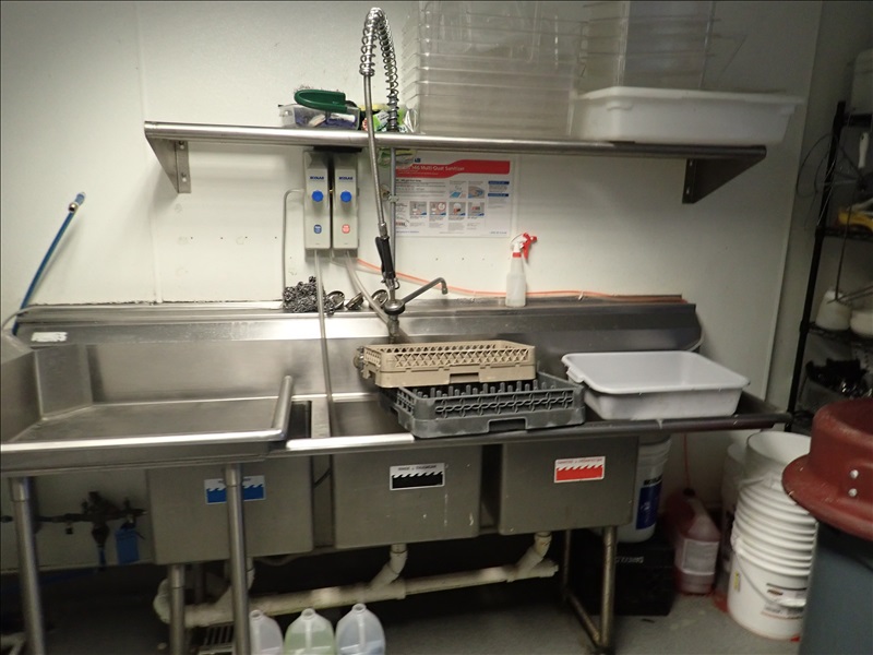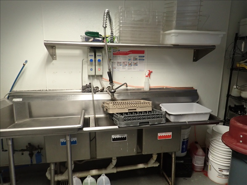 90" 3-COMPARTMENT S/S SINK W/RINSE WAND, FAUCET, SHELF & DISH INFEED