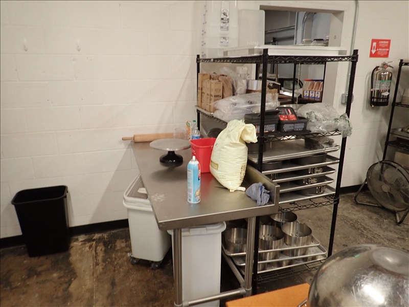 S/S TABLE, BAKERS TABLE, SHEET PANS, DRY GOODS BINS & MISC. BAKING SUPPLIES