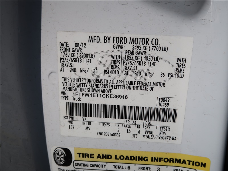 CREW CAB, 4X4 PICKUP TRUCK, V6, AUTO, 6' BED, S/N: 1FTFW1ET1CKE36916, MILES: 152,700