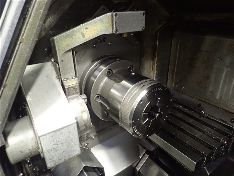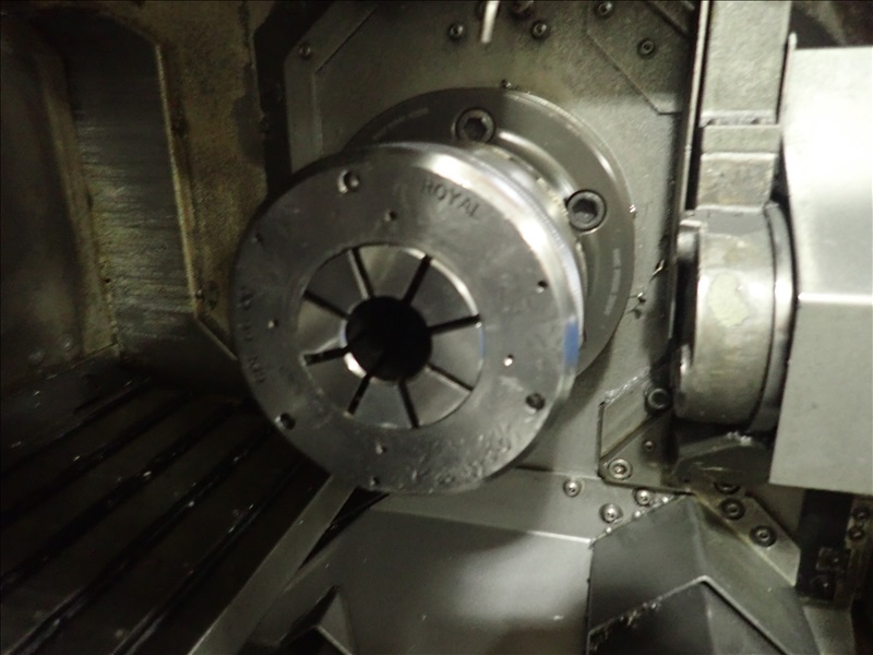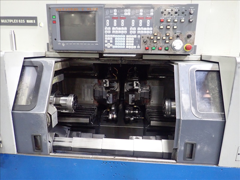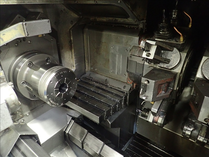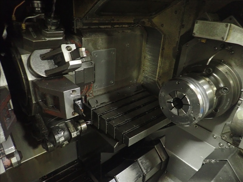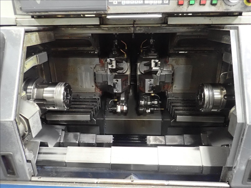 DUAL TURRET CNC LATHE, (2) 12-STATION TURRETS, (7) VERTICAL LIVE TOOL HOLDERS, (3) HORIZONTAL LIVE TOOL HOLDERS, MAYFRAN CT20 CHIP CONVEYOR, MAZATROL T PLUS CONTROLS, BAR FEEDER READY, ROYAL FX1200 FILTERMIST, S/N: 134980