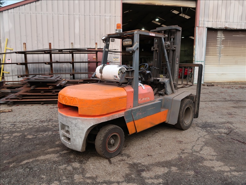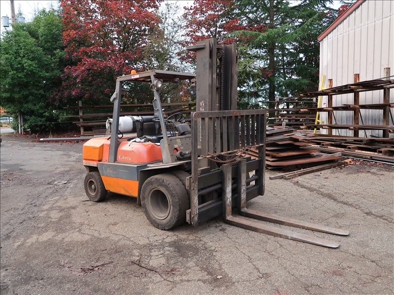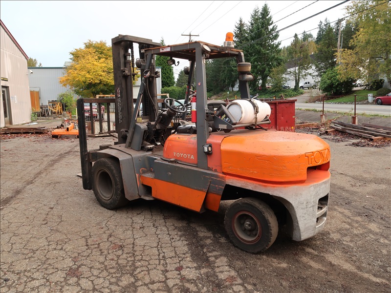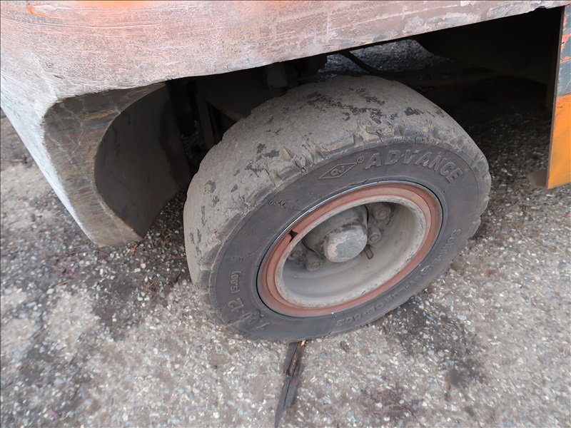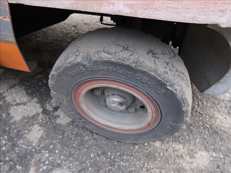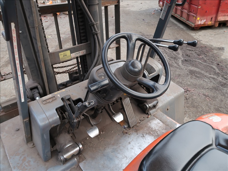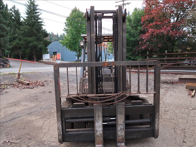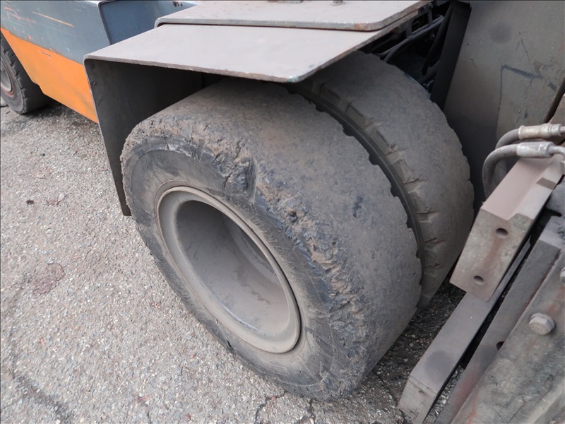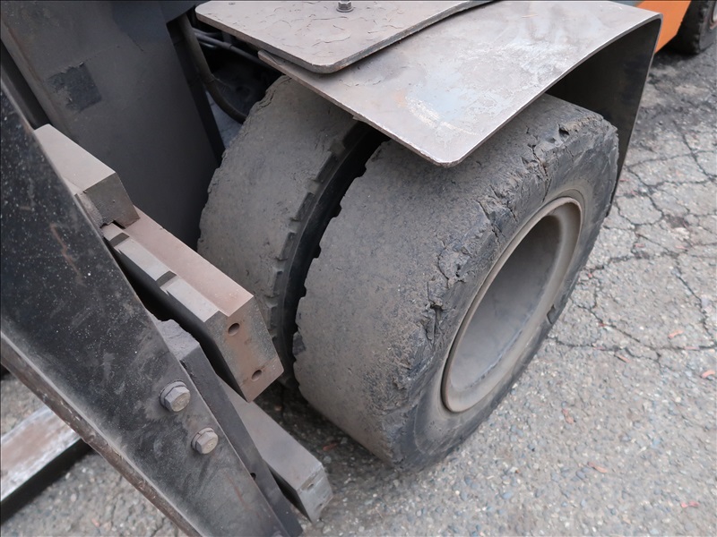 11,000 LB CAP. DUAL CUSHION TIRED FORKLIFT, 2-STAGE MAST, FORK POSITIONERS, PROPANE, HRS: 6,800, S/N: 60047