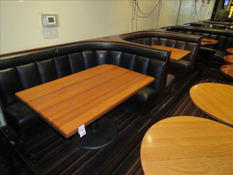 LOT, APPROX 22' X 7' L-SHAPED ROW OF BANQUET SEATING TO INCLUDE: (3) U-SHAPED BOOTH SEATS, (1) 33" X 61" SINGLE PEDESTAL SOLID WOOD DINING TABLE, (1) 36" X 38" SINGLE PEDESTAL SOLID WOOD DINING TABLE & (1) 48" X 48" SINGLE PEDESTAL SOLID WOOD DINING TABLE