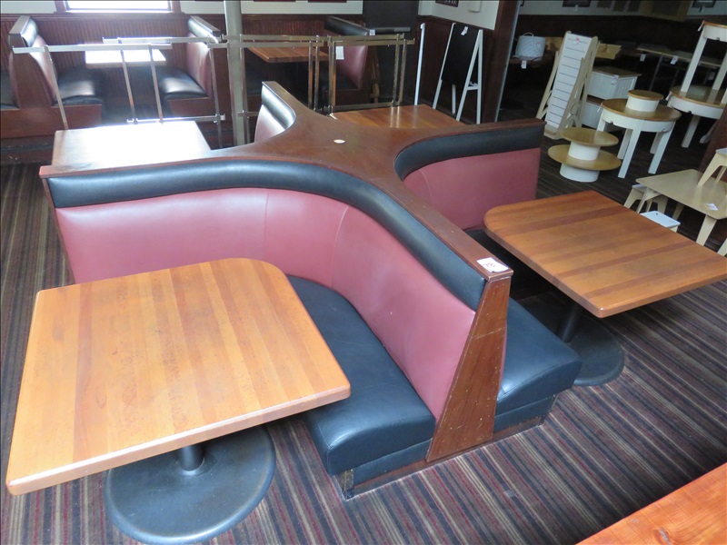 LOT, APPROX 10' X 10' CIRCLE OF BANQUET SEATING TO INCLUDE: (4) 5' X 5' CURVED BENCH SEATS & (4) 40" X 40" SINGLE PEDESTAL SOLID WOOD DINING TABLES