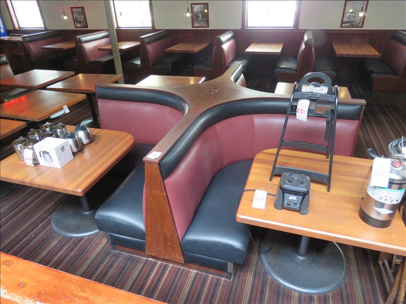 LOT, APPROX 10' X 10' CIRCLE OF BANQUET SEATING TO INCLUDE: (4) 5' X 5' CURVED BENCH SEATS & (4) 40" X 40" SINGLE PEDESTAL SOLID WOOD DINING TABLES