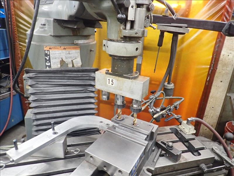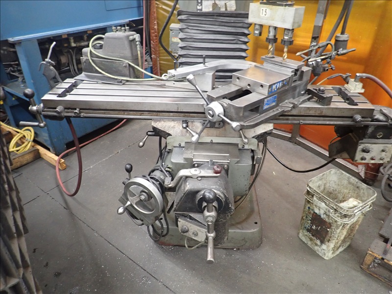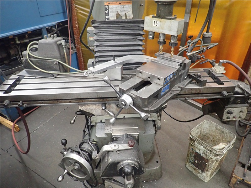 2 HP VERTICAL MILLING MACHINE, 9"X48" POWER TABLE, 3-SPINDLE ATTACHMENT, KURT VISE, BLOWER