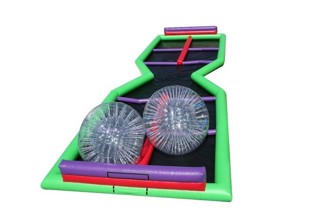 ZORB BALL X TRACK & (2) ZORB BALLS, DIMENSIONS: 75'X23'X4'