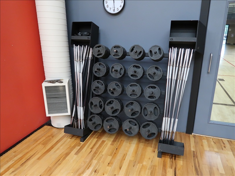 (28) BARBELLS W/ ASSORTED 2.5-10 LB PLATED WEIGHTS & STATION