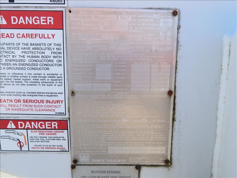 BUCKET TRUCK, TEREX HI RANGER TPL40, 40' 350 LB MAN BASKET, INTERNATIONAL DT 466, AUTO, DRW (DISCLOSURE: ENGINE WON'T STAY RUNNING, PLEASE PREVIEW)