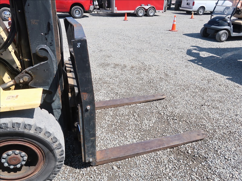 7,650 LB SOLID CUSHION TIRE FORKLIFT, 174" FORK HEIGHT, 3-STAGE MAST, SIDE SHIFT, FORK POSITIONERS, HYDRO SMOOTH ACCUMULATOR, 6 CYL LPG, CAB