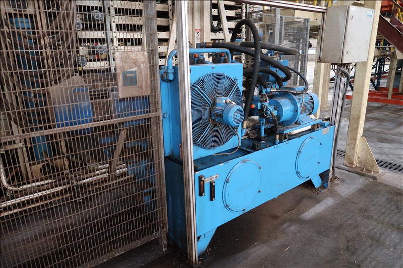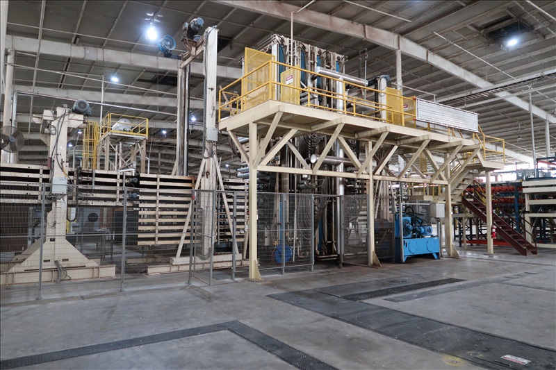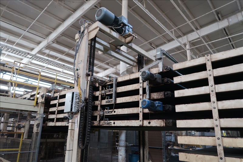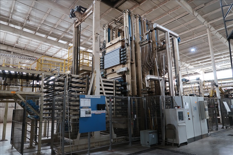 10-OPENING HOT OIL PRESS, 400 PANELS PER HR, MYLAR COVERED 63"X127' POWERED OPENINGS, 120MM OPENING HEIGHT, (2) 10-OPENING CHAMBERS W/(16) 200MM CYLINDERS, (1) SPARE, 717 TONS OF PRESSURE, POWERED 10-OPENING LOADER & UNLOADER W/MOTORIZED ELEVATORS, POWERED 3-OPENING PRE-LOADER, 100 HP HYDRAULIC UNIT W/(2) EATON VICKERS PUMPS, VALVE BLOCK, AIR COOLED, HEIZA TYPE 2XSK-H-TO HOT OIL EXCHANGER, SPARE HYDRAULIC MOTOR, PARTS, (27) ALLEN BRADLEY POWER FACTOR 7-1/2 HP VFD'S, (4) SEW MOVITRAC DRIVES