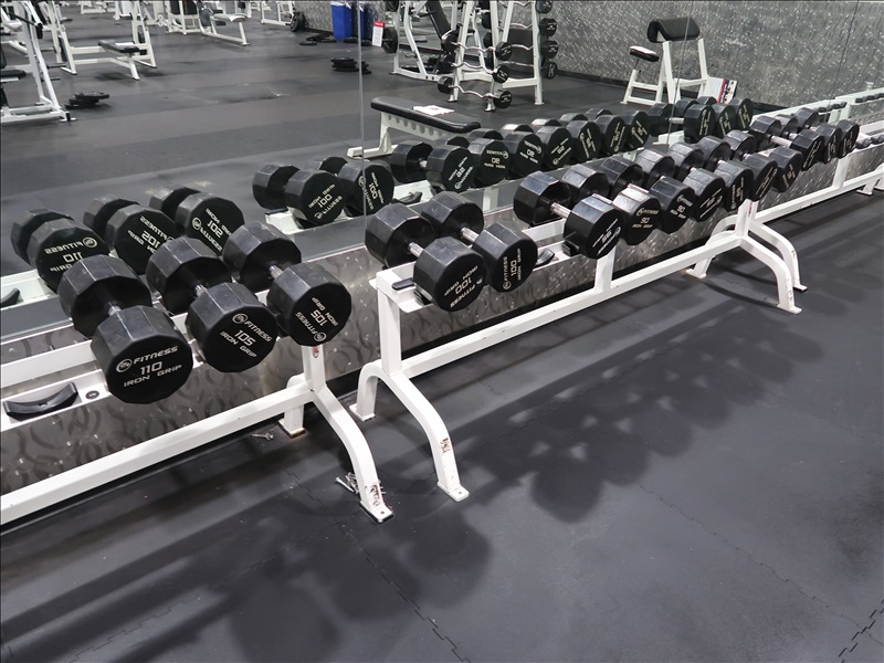 ASSORTED 70LB-110LB DUMBBELLS W/RACKS