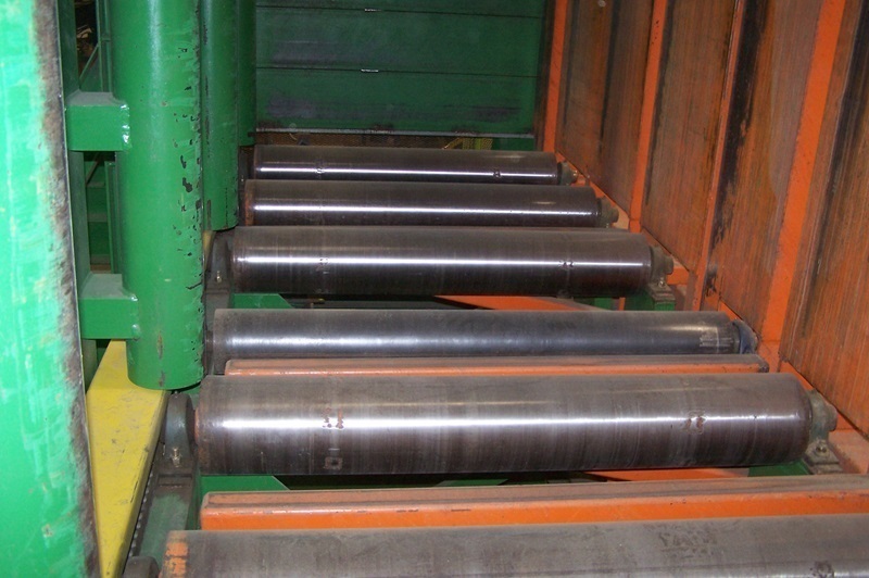 16' 5-ARM X 54" WIDE X 104" HIGH MECHANICAL PACKAGE TILT HOIST W/TECO 20HP/1750RPM MOTOR TO RENOLDS 40:1 RATIO REDUCER W/54"X17' POWERED ROLLCASE W/(7) 8" DIAMETER ROLLS, TECO 10HP/1750 RPM MOTOR TO SM CYCLO HPS3170 17:1 RATIO REDUCER