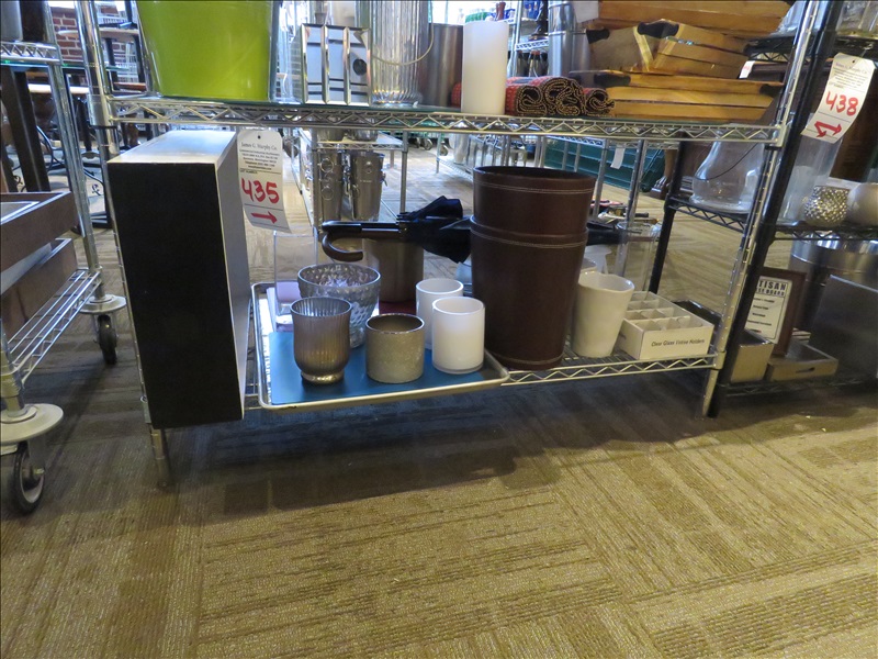 LOT, ASSORTED LINENS, VASES, CANDLE HOLDERS & DECOR ON THIS SHELF